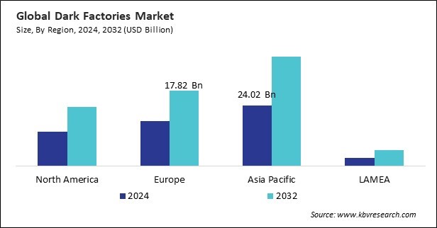 The Asia Pacific region dominated the Global Dark Factories Market by Region in 2024, and would continue to be a dominant market till 2032; thereby, achieving a market value of $43.64 billion by 2032. The Europe region is experiencing a CAGR of 7% during (2025 - 2032). Additionally, The North America region is experience a CAGR of 7.4% during (2025 - 2032).