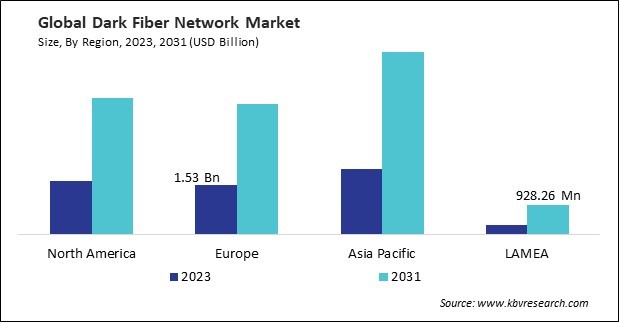 The Asia Pacific market dominated the Global Dark Fiber Network Market by Region in 2023, and would continue to be a dominant market till 2031; thereby, achieving a market value of $5.6 billion by 2031. The North America market is experiencing a CAGR of 12.8% during (2024 - 2031). Additionally, The Europe market would showcase a CAGR of 13.3% during (2024 - 2031).