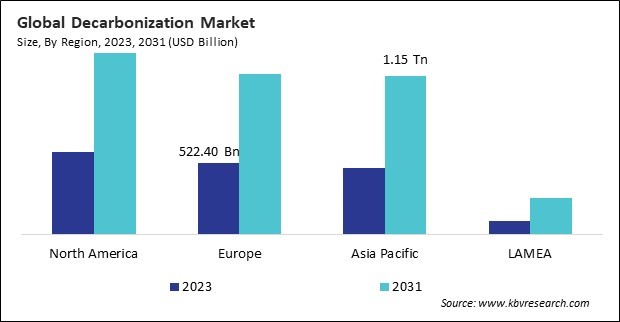 The North America region dominated the Global Decarbonization Market by Region in 2023, and would continue to be a dominant market till 2031; thereby, achieving a market value of $1.32 Trillion by 2031. The Europe region is experiencing a CAGR of 10.8% during (2024 - 2031). Additionally, The Asia Pacific region would exhibit a CAGR of 11.7% during (2024 - 2031).