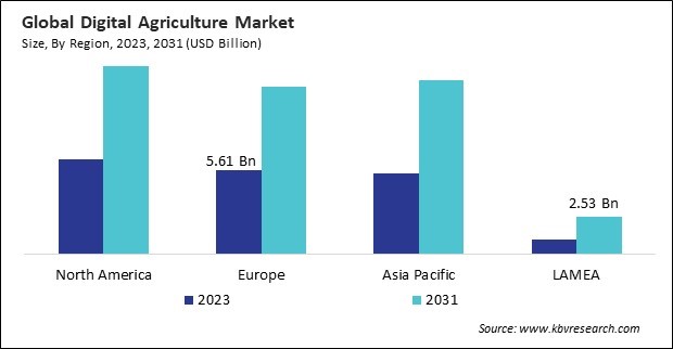 The North America region dominated the Global Digital Agriculture Market by Region in 2023, and would continue to be a dominant market till 2031; thereby, achieving a market value of $12.65 billion by 2031. The Europe region is experiencing a CAGR of 9.4% during (2024 - 2031). Additionally, The Asia Pacific region would exhibit a CAGR of 10.4% during (2024 - 2031).
