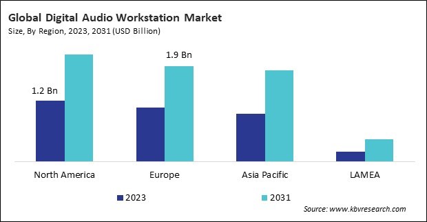 The North America region dominated the Global Digital Audio Workstation Market by Region in 2023; thereby, achieving a market value of $2.1 billion by 2031. The Europe region is anticipated to grow at a CAGR of 7.6% during (2024 - 2031). Additionally, The Asia Pacific region would witness a CAGR of 8.6% during (2024 - 2031).
