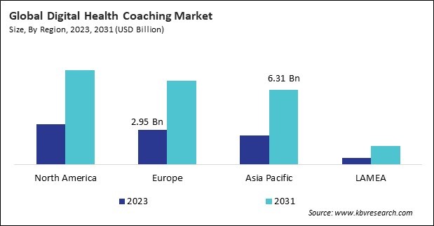 The North America region dominated the Global Digital Health Coaching Market by Region in 2023, and would continue to be a dominant market till 2031; thereby, achieving a market value of $7.96 billion by 2031. The Europe region is exhibiting a CAGR of 11.7% during (2024 - 2031). Additionally, The Asia Pacific region would showcase a CAGR of 12.7% during (2024 - 2031).
