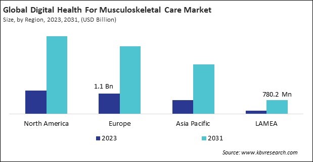 The North America region dominated the Global Digital Health For Musculoskeletal Care Market by Region in 2023, and would continue to be a dominant market till 2031; thereby, achieving a market value of $4.4 billion by 2031. The Europe region is anticipated to grow at a CAGR of 16.6% during (2024 - 2031). Additionally, The Asia Pacific region would witness a CAGR of 17.7% during (2024 - 2031).