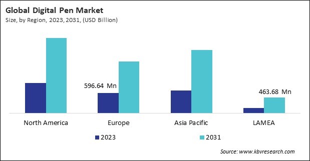 The North America region dominated the Global Digital Pen Market by Region in 2023, and would continue to be a dominant market till 2031; thereby, achieving a market value of $2.23 billion by 2031. The Asia Pacific region is experiencing a CAGR of 13.8% during (2024 - 2031). Additionally, The Europe region would showcase a CAGR of 12.6% during (2024 - 2031).
