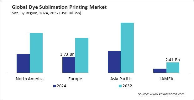 The Asia Pacific region dominated the Global Dye Sublimation Printing Market by Region in 2024, and would continue to be a dominant market till 2032; thereby, achieving a market value of $11.76 billion by 2032. The North America region is experiencing a CAGR of 10.2% during (2025 - 2032). Additionally, The Europe region would exhibit a CAGR of 10.7% during (2025 - 2032).