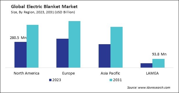 The Europe region dominated the Global Electric Blanket Market by Region in 2023, and would continue to be a dominant market till 2031; thereby, achieving a market value of $503.7 million by 2031. The North America region is experiencing a CAGR of 6.7% during (2024 - 2031). Additionally, The Asia Pacific region would exhibit a CAGR of 7.4% during (2024 - 2031).