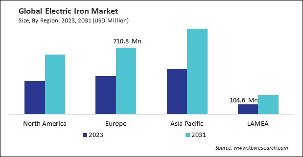The Asia Pacific region dominated the Global Electric Iron Market by Region in 2023, and would continue to be a dominant market till 2031; thereby, achieving a market value of $915.4 Million by 2031. The Europe region is anticipated to grow at a CAGR of 7.3% during (2024 - 2031). Additionally, The North America region would witness a CAGR of 7.7% during (2024 - 2031).
