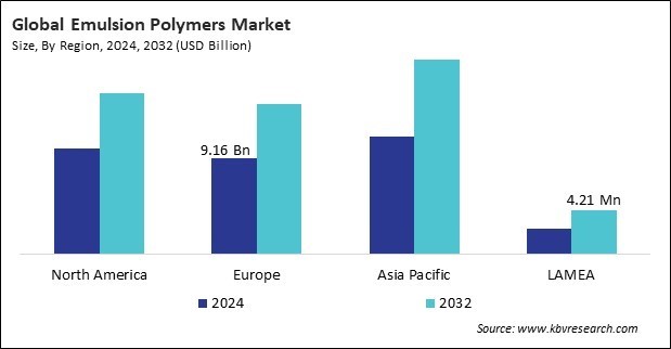 The Asia Pacific region dominated the Global Emulsion Polymers Market by Region in 2024, and would continue to be a dominant market till 2032; thereby, achieving a market value of $18,677.5 million by 2032. The North region market is experiencing a CAGR of 5.5% during (2025 - 2032). Additionally, The Europe region would exhibit a CAGR of 6% during (2025 - 2032).