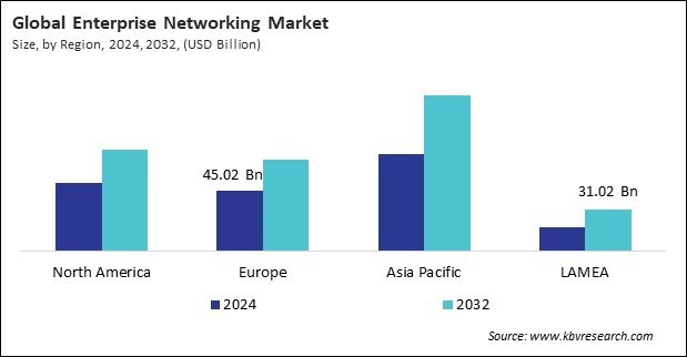 The Asia Pacific region dominated the Global Enterprise Networking Market by Region in 2024, thereby, achieving a market value of $115.89 billion by 2032. The North America region is anticipated to grow a CAGR of 5.1% during (2025 - 2032). Additionally, The Europe region would witness a CAGR of 5.4% during (2025 - 2032).