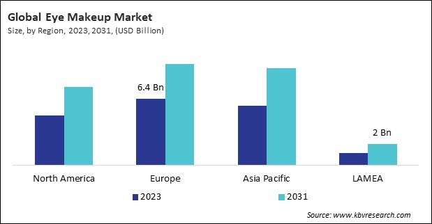 The Europe region dominated the Global Eye Makeup Market by Region in 2023, and would continue to be a dominant market till 2031; thereby, achieving a market value of $9.7 billion by 2031. The Asia Pacific region is anticipated to grow at a CAGR of 6.6% during (2024 - 2031). Additionally, The North America region would witness a CAGR of 5.9% during (2024 - 2031).
