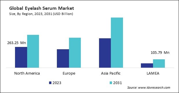 The Asia Pacific region dominated the Global Eyelash Serum Market by Region in 2023, and would continue to be a dominant market till 2031; thereby, achieving a market value of $636.1 Million by 2031. The North America region is anticipated to grow at a CAGR of 6% during (2024 - 2031). Additionally, The Europe region would witness a CAGR of 6.5% during (2024 - 2031).