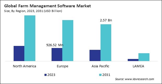 The North America region dominated the Global Farm Management Software Market by Region in 2023; thereby, achieving a market value of $3.19 billion by 2031. The Europe region is expected to witness a CAGR of 15.5% during (2024 - 2031). Additionally, The Asia Pacific region would register a CAGR of 16.3% during (2024 - 2031).