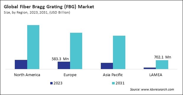 The North America region dominated the Global Fiber Bragg Grating (FBG) Market by Region in 2023, and would continue to be a dominant market till 2031; thereby, achieving a market value of $3.4 billion by 2031. The Europe region is experiencing a CAGR of 22.6% during (2024 - 2031). Additionally, The Asia Pacific region would exhibit a CAGR of 24% during (2024 - 2031).