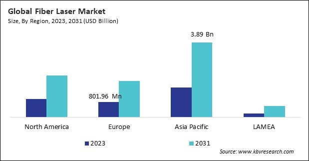 The Asia Pacific region dominated the Global Fiber Laser Market by Region in 2023, and would continue to be a dominant market till 2031; thereby, achieving a market value of $3.9 billion by 2031. The North America region is anticipated to grow at a CAGR of 11.2% during (2024 - 2031). Additionally, The Europe region would witness a CAGR of 11.5% during (2024 - 2031).