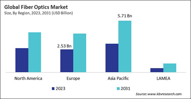 The Asia Pacific region dominated the Global Fiber Optics Market by Region in 2023; thereby, achieving a market value of $5.71 billion by 2031. The North America region is expected to witness a CAGR of 6.7% during (2024 - 2031). Additionally, The Europe region would exhibit a CAGR of 7% during (2024 - 2031).