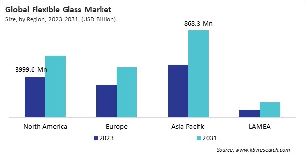 The Asia Pacific region dominated the Global Flexible Glass Market by Region in 2023; thereby, achieving a market value of $868.3 Million by 2031. The North America region is experiencing a CAGR of 5.7% during (2024 - 2031). Additionally, The Europe market would witness a CAGR of 5.9% during (2024 - 2031).