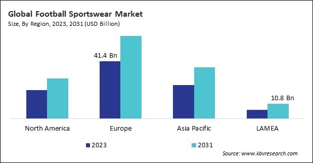 The Europe region dominated the Global Football Sportswear Market by Region in 2023, and would continue to be a dominant market till 2031; thereby, achieving a market value of $59.5 billion by 2031. The Asia Pacific region is experiencing a CAGR of 5.6% during (2024 - 2031). Additionally, The North America market region showcases a CAGR of 4.5% during (2024 - 2031).