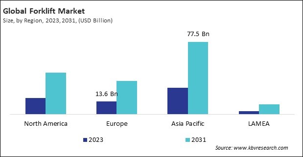 The Asia Pacific region dominated the Global Forklift Market by Region in 2023, and would continue to be a dominant market till 2031; thereby, achieving a market value of $77.5 billion by 2031. The North America region is anticipated to grow at a CAGR of 12.7% during (2024 - 2031). Additionally, The Europe region would witness a CAGR of 12.9% during (2024 - 2031).