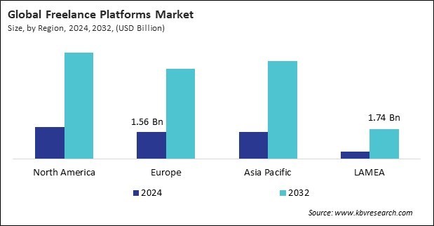 The North America region dominated the Global Freelance Platforms Market by Region in 2024, and would continue to be a dominant market till 2032; thereby, achieving a market value of $6.3 billion by 2032. The Asia Pacific region is anticipated to grow at a CAGR of 17.9% during (2025 - 2032). Additionally, The Europe region would witness a CAGR of 16.8% during (2025 - 2032).