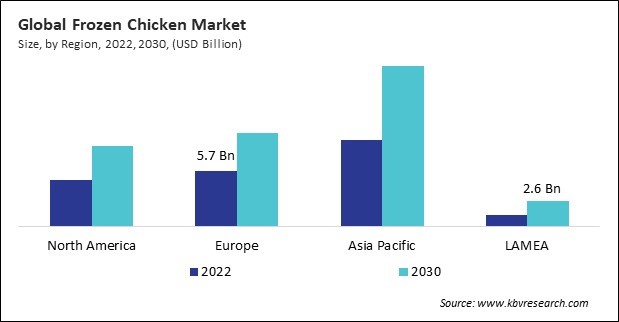 The Asia Pacific region dominated the Global Frozen Chicken Market by Region in 2022 thereby, achieving a market value of $16.6 billion by 2030, growing at a CAGR of 7.9 % during the forecast period. The Europe region is experiencing a CAGR of 6.8% during (2023 - 2030). Additionally, The North America region would witness a CAGR of 7% during (2023 - 2030).