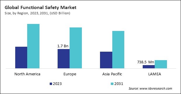 The North America region dominated the Global Functional Safety Market by Region in 2023, and would continue to be a dominant market till 2031; thereby, achieving a market value of $4 billion by 2031. The Europe region is anticipated to grow at a CAGR of 10% during (2024 - 2031). Additionally, The Asia Pacific region would witness a CAGR of 10.7% during (2024 - 2031).