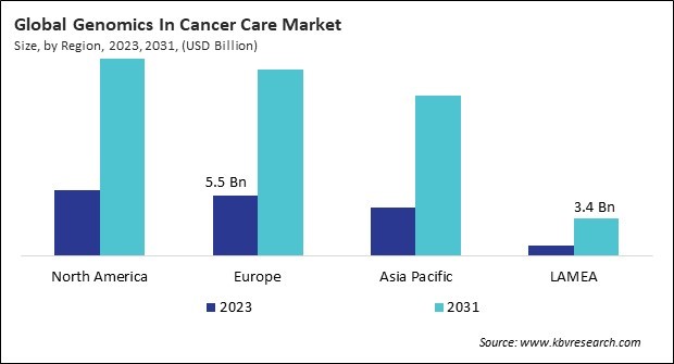 The North America region dominated the Global Genomics In Cancer Care Market by Region in 2023, and would continue to be a dominant market till 2031; thereby, achieving a market value of $18.7 billion by 2031. The Europe region is experiencing a CAGR of 15.5% during (2024 - 2031). Additionally, The Asia Pacific region would showcase a CAGR of 16.3% during (2024 - 2031).