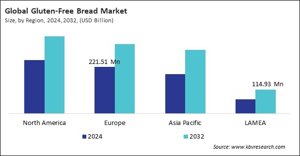 The North America region dominated the Global Gluten-Free Bread Market by Region in 2024; thereby, achieving a market value of $366.7 million by 2032. The Europe region is expected to witness a CAGR of 5.3% during (2025 - 2032). Additionally, The Asia Pacific region would register a CAGR of 6.5% during (2025 - 2032).