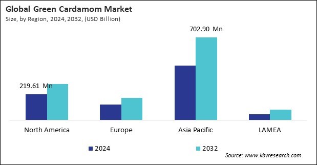 The Asia Pacific region dominated the Global Green Cardamom Market by Region in 2024, thereby, achieving a market value of $702.9 Million by 2032. The North America region is anticipated to grow a CAGR of 4.5% during (2025 - 2032). Additionally, The Europe region would witness a CAGR of 4.8% during (2025 - 2032).