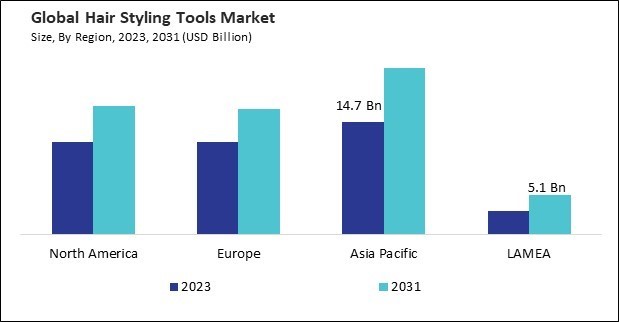The Asia Pacific region dominated the Global Hair Styling Tools Market by Region in 2023, and would continue to be a dominant market till 2031; thereby, achieving a market value of $21.7 billion by 2031. The Europe region is anticipated to grow at a CAGR of 4% during (2024 - 2031). Additionally, The North America region would witness a CAGR of 4.2% during (2024 - 2031).