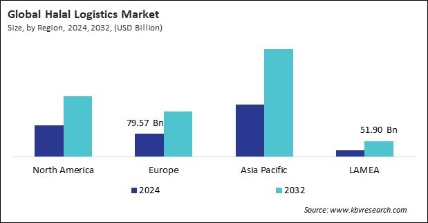 The Asia Pacific region dominated the Global Halal Logistics Market by Region in 2024, and would continue to be a dominant market till 2032; thereby, achieving a market value of $367.9 billion by 2032. The North America region is anticipated to grow at a CAGR of 8.6% during (2025 - 2032). Additionally, The Europe region would witness a CAGR of 8.8% during (2025 - 2032).