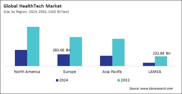 The North America region dominated the Global HealthTech Market by Region in 2024, thereby, achieving a market value of $958.00 billion by 2032. The Europe region is anticipated to grow a CAGR of 12.2% during (2025 - 2032). Additionally, The Asia Pacific region would witness a CAGR of 13.2% during (2025 - 2032).