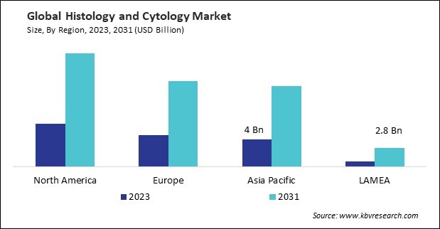 The North America region dominated the Global Histology and Cytology Market by Region in 2023, and would continue to be a dominant market till 2031; thereby, achieving a market value of $16.6 billion by 2031. The Europe region is anticipating a CAGR of 13.4% during (2024 - 2031). Additionally, The Asia Pacific region would exhibit a CAGR of 14.7% during (2024 - 2031).