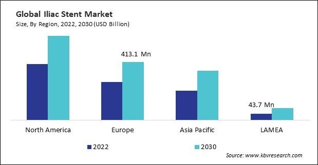 The North America region dominated the Global Iliac Stent Market by Region in 2022, and would continue to be a dominant market till 2030; thereby, achieving a market value of $600 million by 2030. The Europe region is anticipated to grow at a CAGR of 5.5% during (2023 - 2030). Additionally, The Asia Pacific region would witness a CAGR of 6.8% during (2023 - 2030).