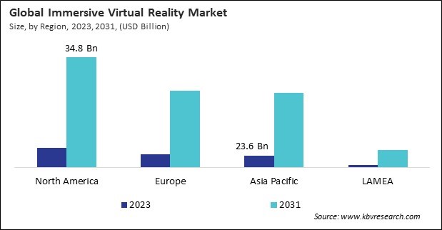 The North America region dominated the Global Immersive Virtual Reality Market by Region in 2023, and would continue to be a dominant market till 2031; thereby, achieving a market value of $34.8 billion by 2031. Europe region is experiencing a CAGR of 25.1% during (2024 - 2031). Additionally, The Asia Pacific region would exhibit a CAGR of 26.3% during (2024 - 2031).