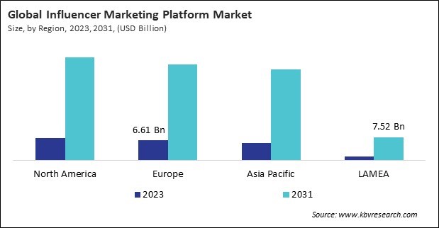 The North America region dominated the Global Influencer Marketing Platform Market by Region in 2023, and would continue to be a dominant market till 2031; thereby, achieving a market value of $34.4 billion by 2031. The Europe region is anticipated to grow at a CAGR of 22.5% during (2024 - 2031). Additionally, The Asia Pacific region would witness a CAGR of 23.8% during (2024 - 2031).