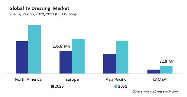 The North America region dominated the Global IV Dressing Market by Region in 2023, and would continue to be a dominant market till 2031; thereby, achieving a region value of $502.6 Million by 2031. The Europe region poised to grow at a CAGR of 5.5% during (2024 - 2031). Additionally, The Asia Pacific region would witness a CAGR of 6.7% during (2024 - 2031).