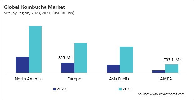 The North America region dominated the Global Kombucha Market by Region in 2023, and would continue to be a dominant market till 2031; thereby, achieving a market value of $3.9 billion by 2031. The Europe region is experiencing a CAGR of 14.6% during (2024 - 2031). Additionally, The Asia Pacific region would exhibit a CAGR of 16.1% during (2024 - 2031).