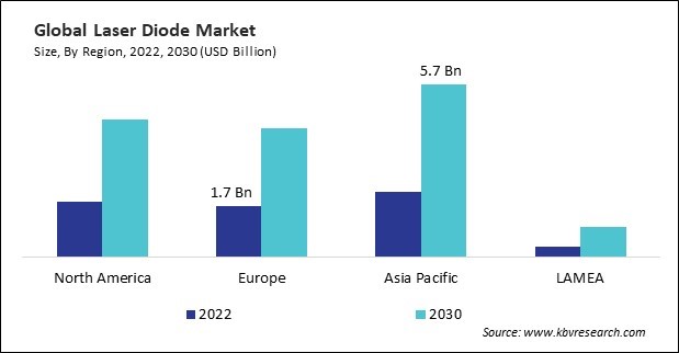 The Asia Pacific region dominated the Global Laser Diode Market by Region in 2022, and would continue to be a dominant market till 2030; thereby, achieving a market value of $5.7 billion by 2030. The Europe region is anticipating a CAGR of 12.6% during (2023 - 2030). Additionally, The North America region would exhibit a CAGR of 12.4% during (2023 - 2030).
