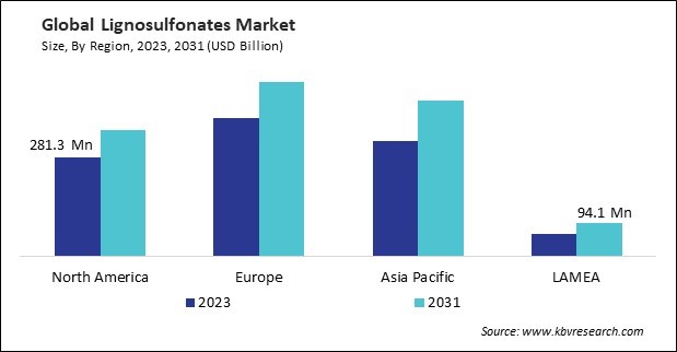 The Europe region dominated the Global Lignosulfonates Market by Region in 2023, and would continue to be a dominant market till 2031; thereby, achieving a market value of $498.2 Million by 2031. The Asia Pacific region is showcasing a CAGR of 4% during (2024 - 2031). Additionally, The North America region would exhibit a CAGR of 3.3% during (2024 - 2031).