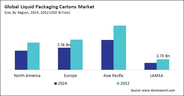 The Asia Pacific region dominated the Global Liquid Packaging Cartons Market by Region in 2024, and would continue to be a dominant market till 2032; thereby, achieving a market value of $15.5 billion by 2032. The Europe region is anticipated to grow at a CAGR of 4.2% during (2025 - 2032). Additionally, The North America region would witness a CAGR of 4.7% during (2025 - 2032).