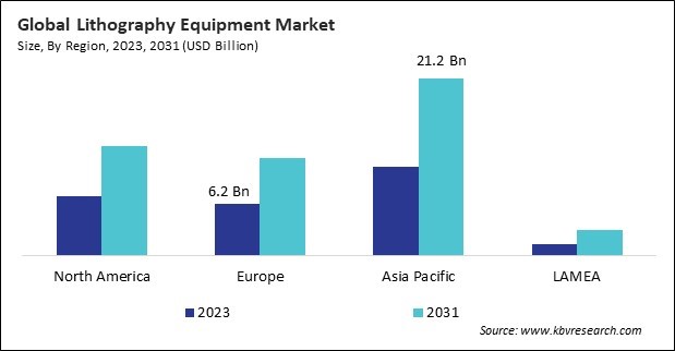 The Asia Pacific region dominated the Global Lithography Equipment Market by Region in 2023; thereby, achieving a market value of $21.2 billion by 2031. The North America region is expected to witness a CAGR of 8.2% during (2024 - 2031). Additionally, The Europe region would capture a CAGR of 8.4% during (2024 - 2031).