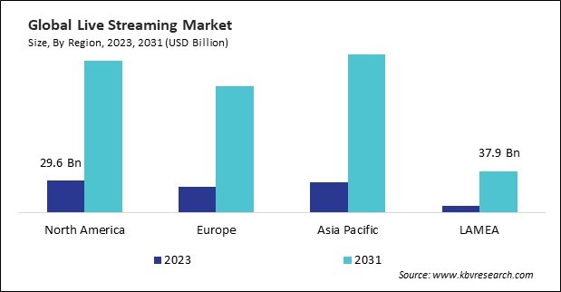 The North America region dominated the Global Live Streaming Market by Region in 2023, thereby, achieving a market value of $29.6 billion in 2023. However, The Asia Pacific region would overtake the North America market by 2031, thereby achieving a market value of $145.1 billion by 2031. Additionally, The Europe region would witness a CAGR of 22.7% during (2024 - 2031).