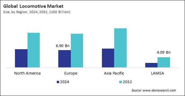 The Asia Pacific region dominated the Global Locomotive Market by Region in 2024, and would continue to be a dominant market till 2032; thereby, achieving a market value of $15.49 billion by 2032. The North America region is experiencing a CAGR of 8.6% during (2025 - 2032). Additionally, The Europe region would exhibit a CAGR of 8.9% during (2025 - 2032).