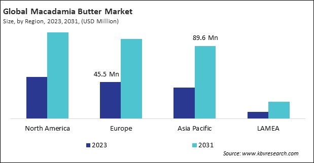 The North America region dominated the Global Macadamia Butter Market by Region in 2023, and would continue to be a dominant market till 2031; thereby, achieving a market value of $106.5 million by 2031. The Europe region is experiencing a CAGR of 10.8% during (2024 - 2031). Additionally, The Asia Pacific region would exhibit a CAGR of 11.8% during (2024 - 2031).