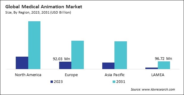 The North America region dominated the Global Medical Animation Market by Region in 2023; thereby, achieving a market value of $592.1 million by 2031. The Europe region is expected to witness a CAGR of 18.5% during (2024 - 2031). Additionally, The Asia Pacific region would register a CAGR of 20% during (2024 - 2031).