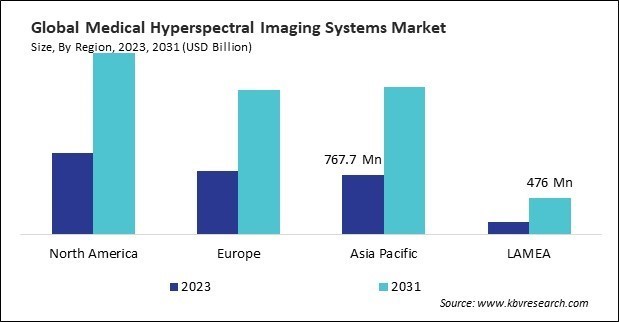 The North America region dominated the Global Medical Hyperspectral Imaging Systems Market by Region in 2023, and would continue to be a dominant market till 2031; thereby, achieving a market value of $2.4 Billion by 2031. The Europe region is anticipated to grow a CAGR of 11.1% during (2024 - 2031). Additionally, The Asia Pacific region would witness a CAGR of 12.3% during (2024 - 2031).