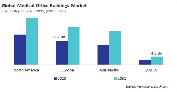 The North America region dominated the Global Medical Office Buildings Market by Region in 2023, and would continue to be a dominant market till 2031; thereby, achieving a market value of $23.2 billion by 2031. The Europe region is anticipated to grow at a CAGR of 6.1% during (2024 - 2031). Additionally, The Asia Pacific region would witness a CAGR of 6.9% during (2024 - 2031).