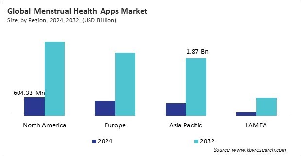 The North America region dominated the Global Menstrual Health Apps Market by Region in 2024, and would continue to be a dominant market till 2032; thereby, achieving a market value of $2.4 billion by 2032. The Europe region is anticipated to grow at a CAGR of 19.5% during (2025 - 2032). Additionally, The Asia Pacific region would witness a CAGR of 20.8% during (2025 - 2032).
