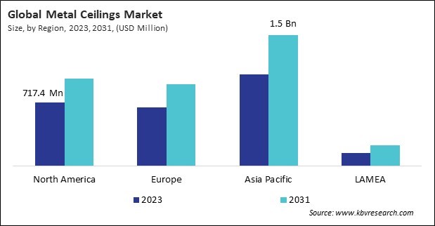 The Asia Pacific region dominated the Global Metal Ceilings Market by Region in 2023, and would continue to be a dominant market till 2031; thereby, achieving a market value of $1.5 billion by 2031. The North America region is experiencing a CAGR of 4.2% during (2024 - 2031). Additionally, The Europe region would exhibit a CAGR of 4.4% during (2024 - 2031).