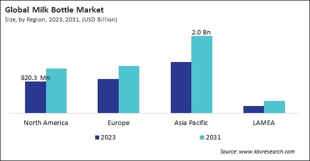 The Asia Pacific region dominated the Global Milk Bottle Market by Region in 2023, and would continue to be a dominant market till 2031; thereby, achieving a market value of $2.1 billion by 2031. The Europe region is experiencing a CAGR of 4.3% during (2024 - 2031). Additionally, The North America region would exhibit a CAGR of 4.6% during (2024 - 2031).